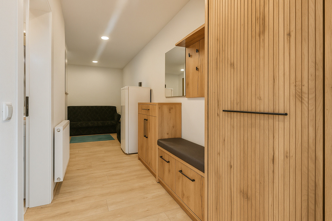 -Flexibilitate excelentă a spațiului: garsoniera poate funcționa natural ca birou/recepție pentru o micro-afacere cu flux clar pentru clienți, în timp ce casa rămâne zona de locuit.