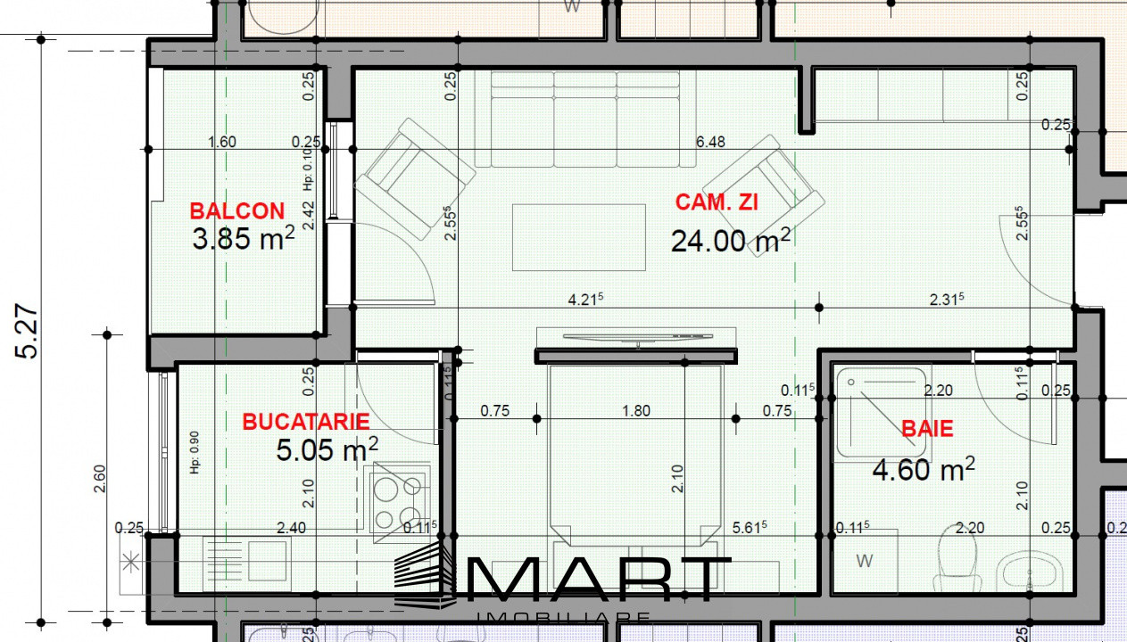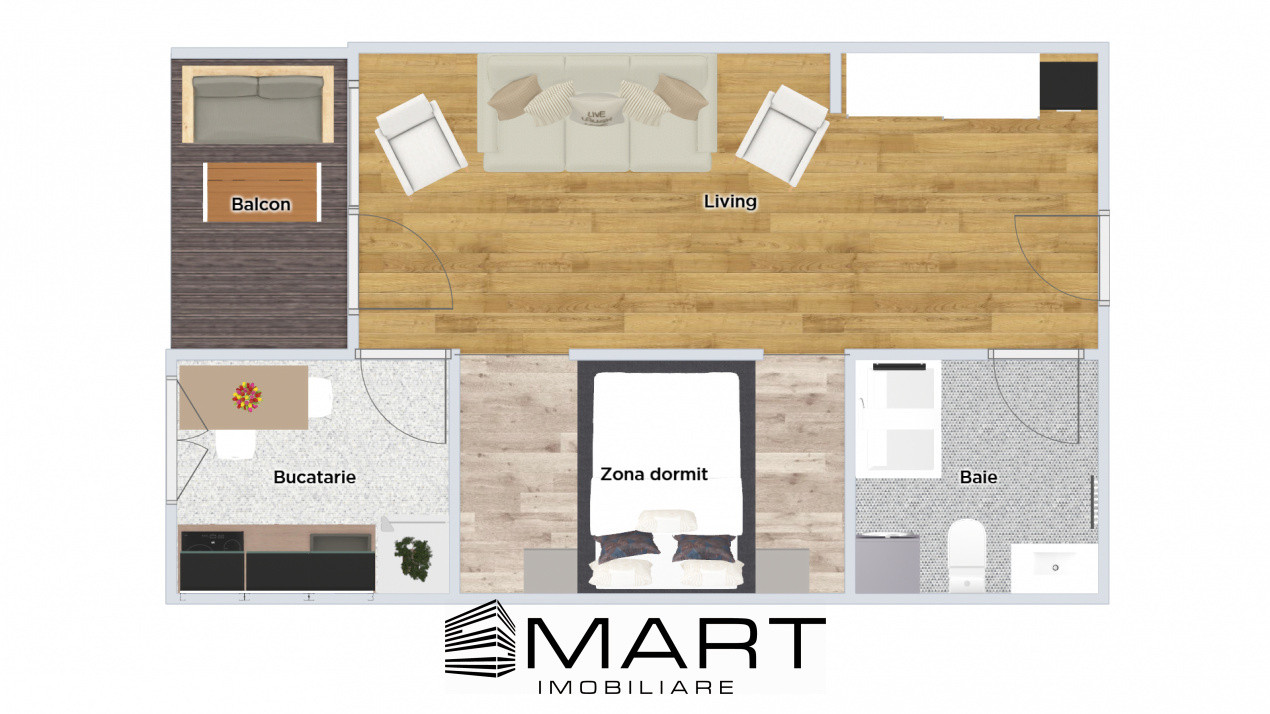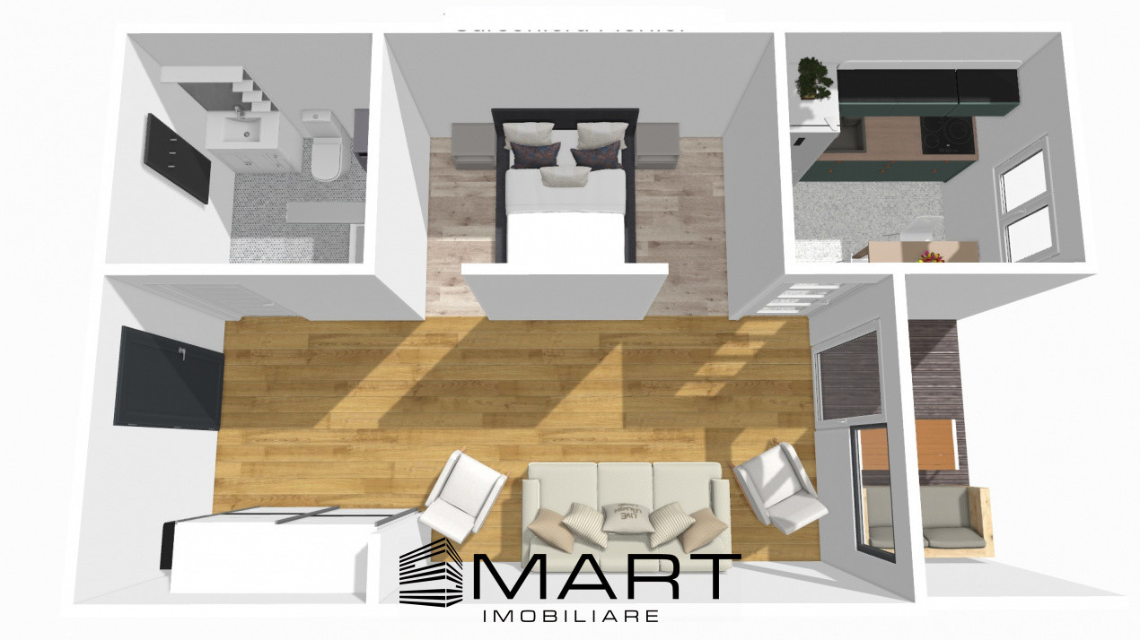 Apartamentul este situat la parterul inalt si dispune de o suprafata utila de 33mp plus 1 balcon de 4mp, fiind compus din living cu separare pentru zona de dormit, bucatarie separata si baie.