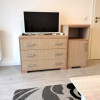 - Living generos cu canapea extensibilă, televizor, mobilier modern