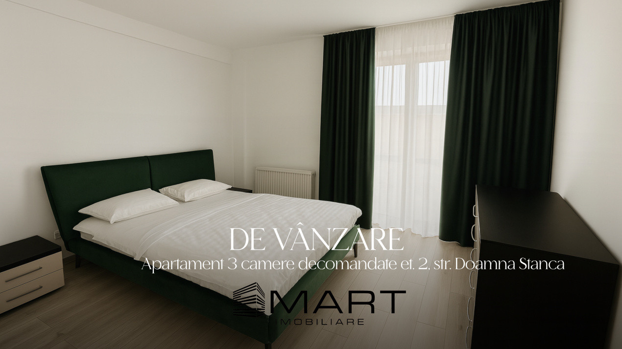 Smart Imobiliare vinde un apartament cu 3 camere pe str. Doamna Stanca, intr-un bloc cu lift. Pozitionat la etajul 2, acesta este compus din living cu bucatarie si zona de servit masa, 2 dormitoare cu paturi matrimoniale si baie, la care se adauga un balcon de 15 mp, cu iesire atat din bucatarie, cat si din dormitoare. Are o disponibilitate imediata si se preda complet echipat si mobilat.