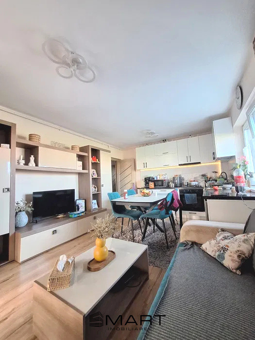 Compartimentarea este una practică, cu o delimitare clară între zona de zi și zona de noapte. Apartamentul cuprinde living cu bucatarie, 2 dormitoare, 1 baie, debara și hol de acces. Spațiile exterioare includ o gradina proprie in suprafata de 88 mp amenajata cu filigorie ( cu mobilier de gradina), gratar, copaci ornamentali naturali, fantanita cu apa, gazon, camere de supraveghere, lumini ambientale, poarta de acces si doua locuri de parcare.