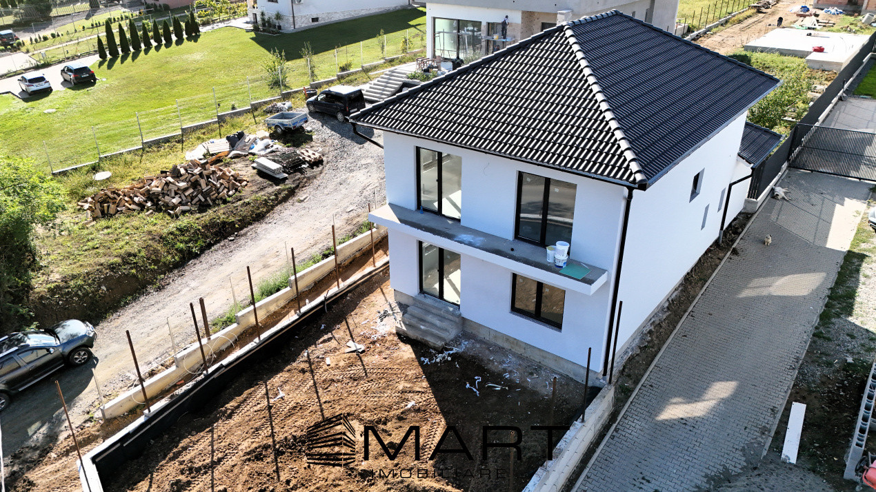 Predarea casei se face la stadiul de CHEIE la exterior, la interior la stadiul de ALB cu pompe de caldura si incalzire in pardoseala, geamuri din tamplarie PVC, usa la intrare, curte nivelata, poarta, gard, izolatie exterioara.