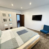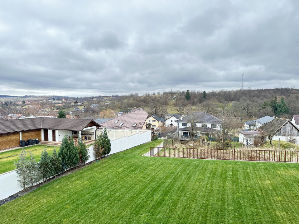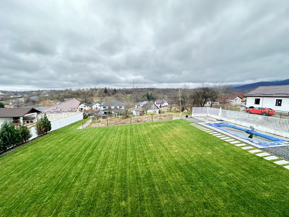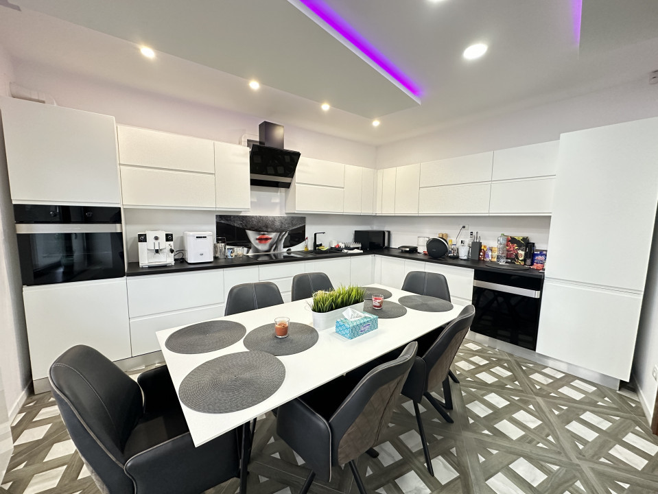 Interiorul casei este decorat de designer fiind compartimentat astfel: hol cu dressing, camera tehnica cu spalatorie-uscatorie, bucatarie open-space, livingroom, birou, dormitor matrimonial, 2 dormitoare si o baie. In exteriorul casei exista o zona de relaxare cu piscina incalzita (30 mp), construita din beton si decorata cu umini ambientale. In incinta casei avem sauna dotata cu sare de himalaya, jacuzzi, scaune incalzite spa etc.