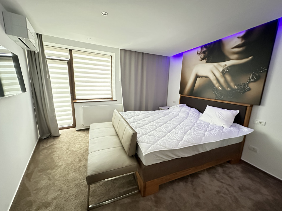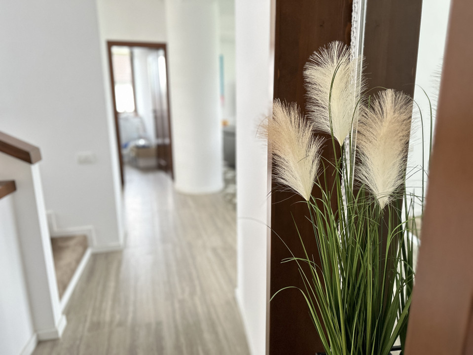 Gradina este amenajata cu arbusti , plante decorative si dispune de sistem de irigatii complet automat. Casa este dotata cu sistem de alarma, supraveghere video, video-interfon, automatizare poarta acces auto + acces pietonal. Imobilul se inchiriaza complet mobilat si utilat, finisajele si mobilierul sunt de inalta calitate.