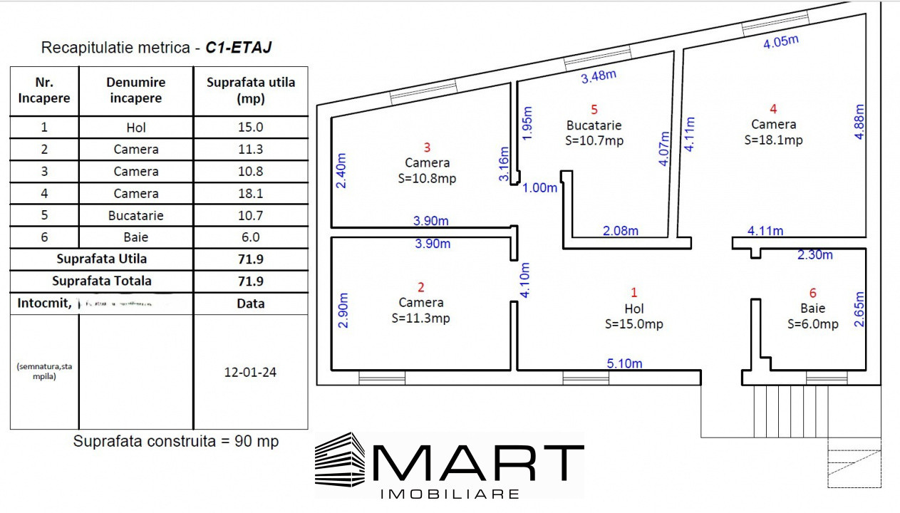 Etajul dispune de 3 dormitoare, bucatarie, hol si baie.