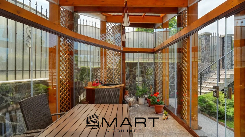 Curte amenajată profesionist, spațiu cu leagăn, grătar și foișor din lemn stratificat cu panouri culisante din sticlă securizată. Gard placat cu piatră naturală, trotuare și foișor din granit. Anexă izolată 12 mp, finisată cu parchet și rafturi.